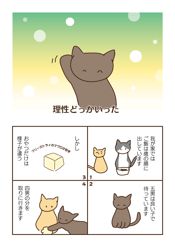 五男が大好きなのはフリーズドライのマグロ味。パッケージを見せるだけで飛んできます。四男と半分こであげます。(三男はなぜかフリーズドライは食べない)すると自分の分をさっさと食べて、のんびりモグモグしている四男の側へ忍び寄る五男…。これが弱肉強食か。まぁ四男が取られてしまっても、おやつくらいなら追加してあげられます。