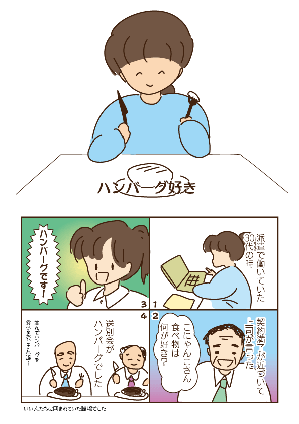 契約終了が近づいてくると、いろんな部署の人が食事に誘ってくれました。上司たちは昭和のおじさんで、歓送迎会は飲み屋が普通。しかしこの時はおじさんたちが並んでハンバーグを食べました。なんだか悪いかなぁと思いました。
