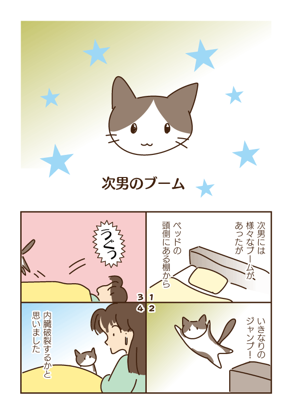 ネコ様のブーム ネコ X Facebook はてブ LINE コピー 2025.11.26 ネコにもマイブームがあるようです。特に次男はよくありました。穴掘りブームとかネコ砂くねくねブームとか。かわいいものも多いのですが。 次男がベッドの棚から寝ている私に向かってジャンプする、このブーム。結構つらいです。次男は当時6kg弱。結構な衝撃です。しかも、いつ飛んでくるかわからない。なかなかスリリングです。でもかわいく「どうかした?」みたいな顔をされると許しちゃうんですよ。