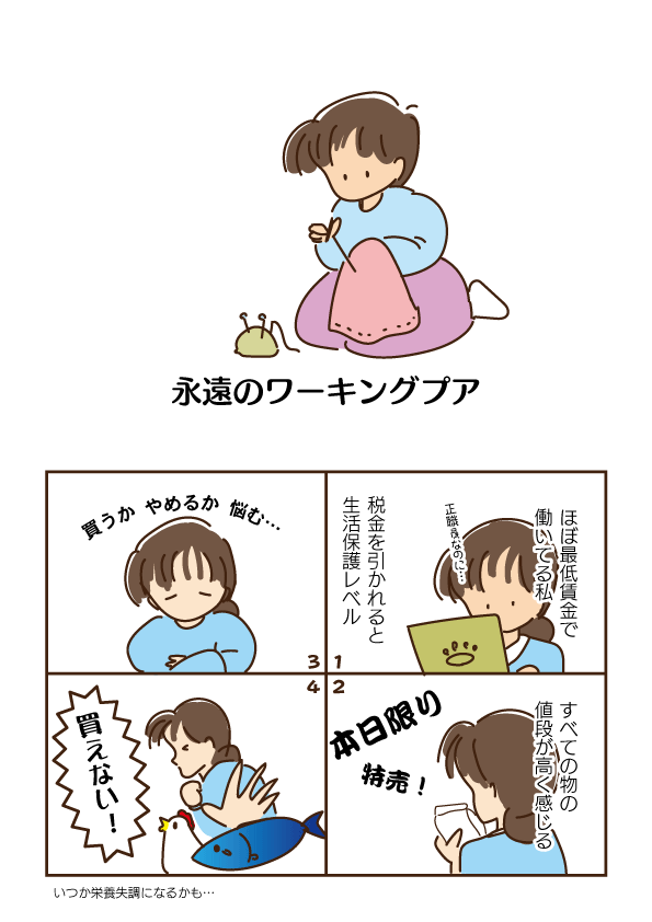 今は正職員でフルタイムで働いているのに、手取りは生活保護レベル。賃上げもなし。物価だけが上昇してゆく…何年働いても昇級がないので永遠にほぼ最低賃金で働いています。我ながらよく生きてるなと思います。
